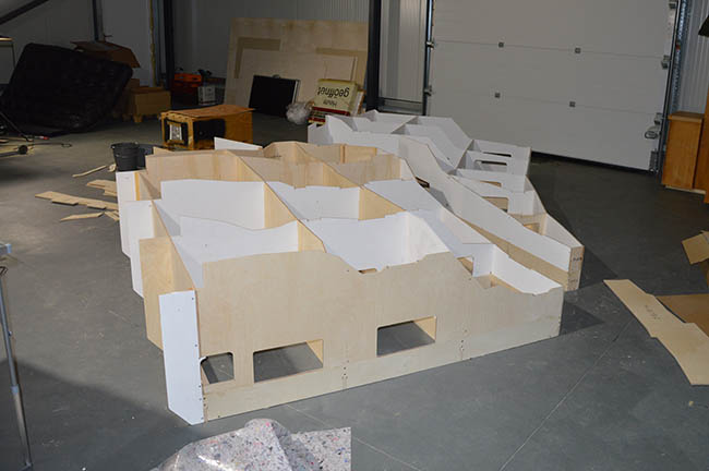 Auf den offenen Rahmen werden die Konstruktionsspanten der späteren Landschaft gesetzt. Quer- und Längsspanten ergänzen sich zu einem stabilen Gebilde. Die Öffnungen in den Spanten dienen teilweise der Durchführung von Bahntrassen als auch der Straßen für das DC-Car-System.