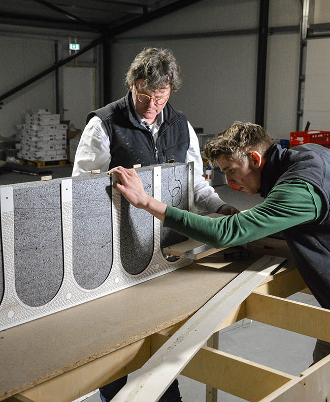 Beim Modulbau verfüllt Karl Fischer eine kleine Fuge mit einem Gemisch aus Holzleim und feinem Sägestaub. Es ist das Modul 1 am 23.01.2019, zwei Tage zuvor.