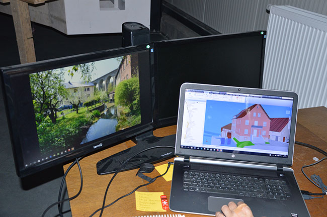Auf dem großen Monitor ist die Ölmühle im Anschnitt zu erkennen. Der Laptopbildschirm zeigt einen Ausschnitt aus Bernards 3D Zeichnung. Die Ölmühle besteht aus einem "Doppelhaus", einem Anbau und einer Scheune, so gezählt sind es vier Gebäude.