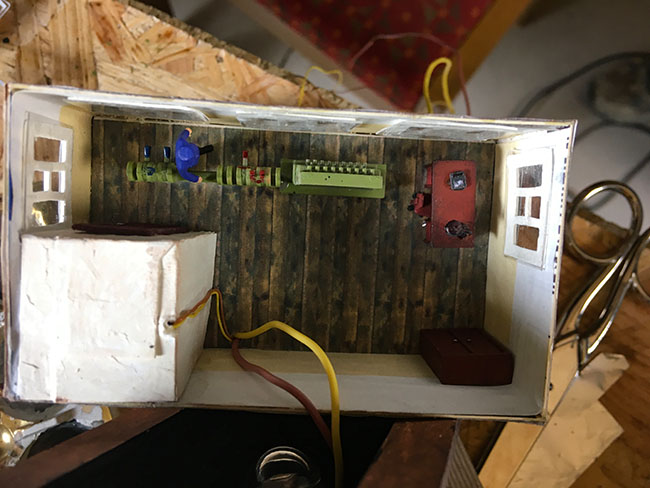 Inneneinrichtung für das mechanische Stellwerk "Schierenberg". Einen Selbstbau haben wir diesmal gescheut und auf "FALLER 120118 Inneneinrichtung für Stellwerk Spur H0" zurückgegriffen. Schließlich ist es ja "nur" was zumreinschauen, was während der Nachtphase zu sehen sein wird. Tagsüber sind innere Werte nicht erkennbar. Während das Pult mit Diensttelefon noch recht ansprechend aussieht, sind bei den Hebelbänken höchstens grobe Ähnlichkeiten erkennbar. Liebe Fallers: Die Hebelbänke sind viel zu grobschlächtig, wichtige Details fehlen, das geht mit heutigen Mitteln viel besser. Der Bausatz 120118 bräuchte eine Überarbeitung!